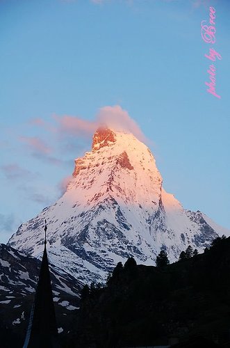 住在Le Mozot最大的賣點,就是可以直接在房間的陽台就可欣賞日出的馬特洪峰,不用跑到教堂那邊去.不過日出不好捉,可憐的老公為了拍日出照給我看.由4點半開始等,到5點多都還沒看到,當他不支倒地時,剛好就日出了,哈,還好我有接力下去,拍到了一張沐浴在晨光的馬特洪峰.